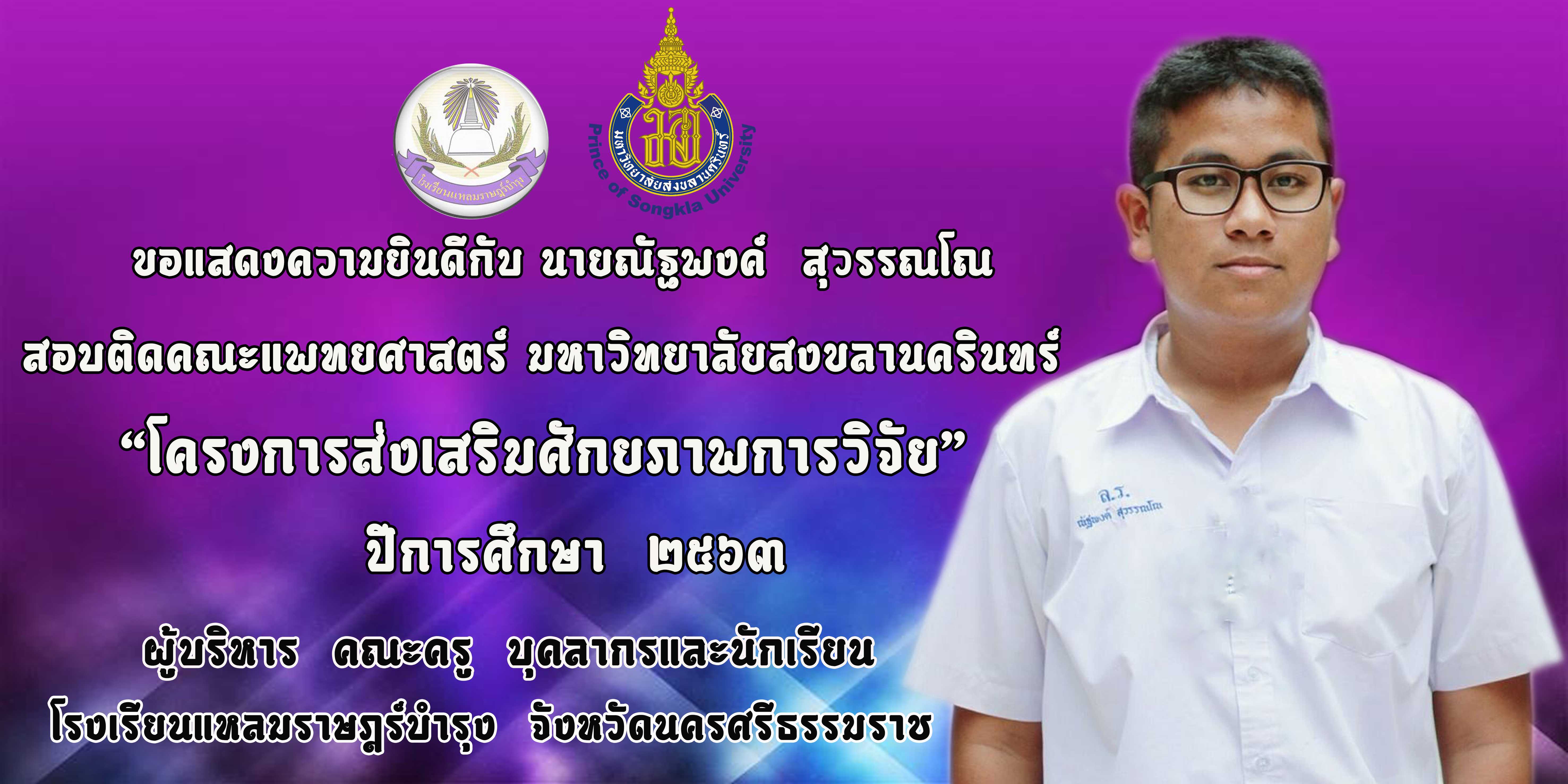 ขอแสดงความยินดีกับนายณัฐพงค์ สุวรรณโณ นักเรียนชั้นมัธยมศึกษาปีที่ 6 โรงเรียนแหลมราษฎร์บำรุง ได้รับการคัดเลือกเข้าศึกษาต่อ คณะแพทยศาสตร์ มหาวิทยาลัยสงขลานครินทร์ โครงการส่งเสริมศักยภาพการวิจัย ประจำปีการศึกษา 2563