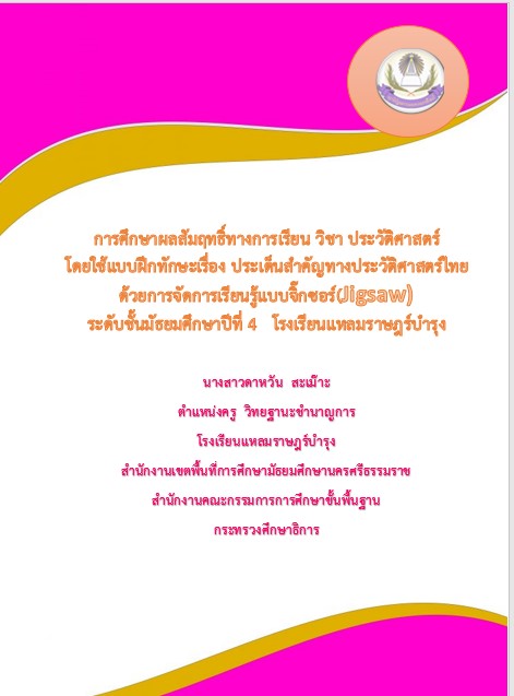 เผยแพร่ผลงาน การศึกษาผลสัมฤทธิ์ทางการเรียน วิชา ประวัติศาสตร์ โดยใช้แบบฝึกทักษะเรื่อง ประเด็นสำคัญทางประวัติศาสตร์ไทย ด้วยการจัดการเรียนรู้แบบจิ๊กซอร์(Jigsaw) ระดับชั้นมัธยมศึกษาปีที่ 4 โรงเรียนแห