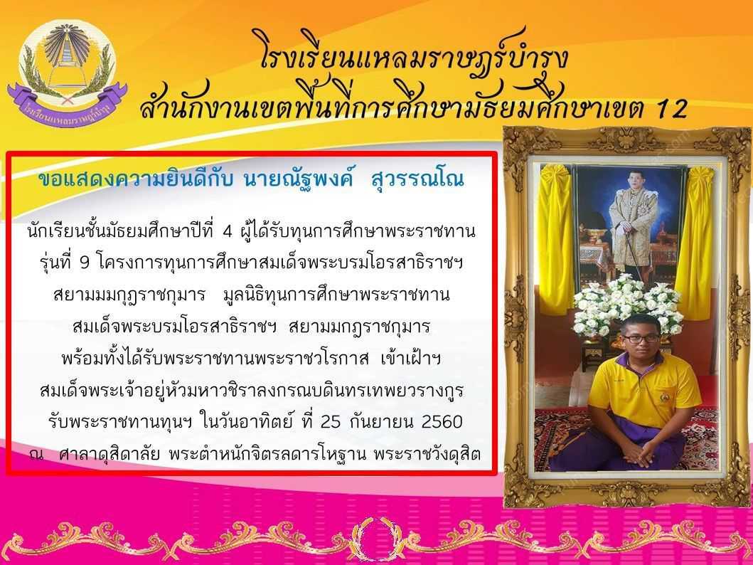 ขอแสดงความยินดีกับนายณัฐพงศ์ สุวรรณโณ นักเรียนชั้นมัธยมศึกษาปีที่ 4 ผู้ได้รับทุนการศึกษาพระราชทาน รุ่นที่ 9 โครงการทุนการศึกษาสมเด็จพระบรมโอรสาธิราชฯ สยามมมกุฎราชกุมาร มูลนิธิทุนการศึกษาพระราชทานสมเด็จพระบรมโอรสาธิราชฯ สยามมกุฎราชกุมาร พร้อมทั้งได้รับพระราชทานพระราชวโรกาส เข้าเฝ้าฯ สมเด็จพระเจ้าอยู่หัวมหาวชิราลงกรณ บดินทรเทพยวรางกูร รับพระราชทานทุนฯ ในวันอาทิตย์ ที่ 25 กันยายน 2560 ณ ศาลาดุสิดาลัย พระตำหนักจิตรลดารโหฐาน พระราชวังดุสิต