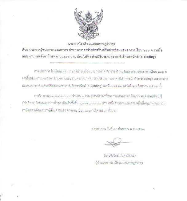 ประกาศผู้ชนะการเสนอราคา ประกวดราคาจ้างก่อสร้างปรับปรุงซ่อมแซมอาคารเรียน ๒๑๖ ค งานรื้อถอน งานมุงหลังคา ฝ้าเพดานและงานดวงโคมไฟ ด้วยวิธีประกาศราคาอิเล็กทรอนิกส์ (e-budding)
